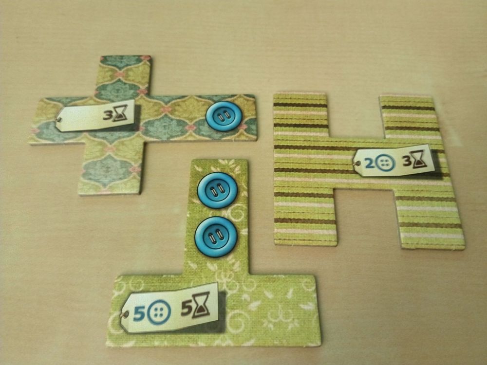 Además el tablero central tiene dibujado unos botones. Cuando un jugador pase por encima de uno de estos, recibirá tantos botones como tenga en los parches de su colcha.
