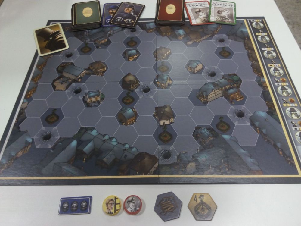 Colocamos el tablero y disponemos, sobre éste, las tapas de alcantarilla, faroles encendidos, cordones policiales e investigadores como marcan las instrucciones. El jugador que represente a la autoridad deberá sentarse por el lado amarillo del tablero, mientras que Jack lo hará en el lado gris.