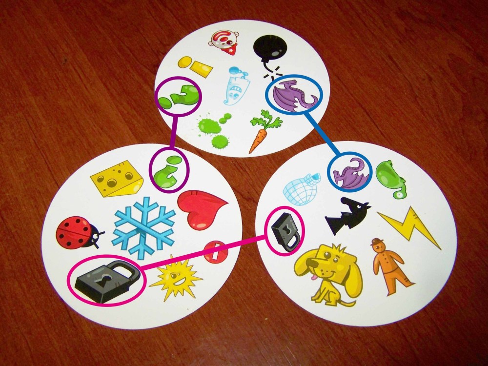 Se deja una carta boca arriba en la parte central y se reparten todas las cartas al resto de participantes. Todas las cartas de un participante deben estar boca abajo y formando un mazo. Todos ponen su carta al descubierto a la vez. Aquel que de manera clara y alta diga el elemento que coincide entre su carta y la central, pone su carta sobre la central para convertirla en nueva carta de referencia. El último jugador en deshacerse de todas sus cartas habrá perdido.