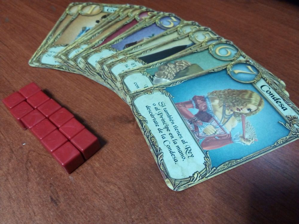 - Condesa: Tiene un valor de 7. Si el jugador posee al Rey o al Príncipe en la mano tendrá que descartarse de la condesa.