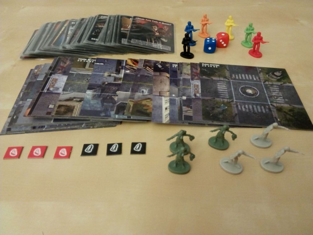 Cada jugador selecciona su figura de superviviente y lo coloca en la ficha de «Plaza Central«, adquiere al azar 3 cartas de evento del mazo, que previamente ha sido barajado, y se elige al jugador inicial. Cada jugador adquiere 3 contadores de vida y 3 de bala.