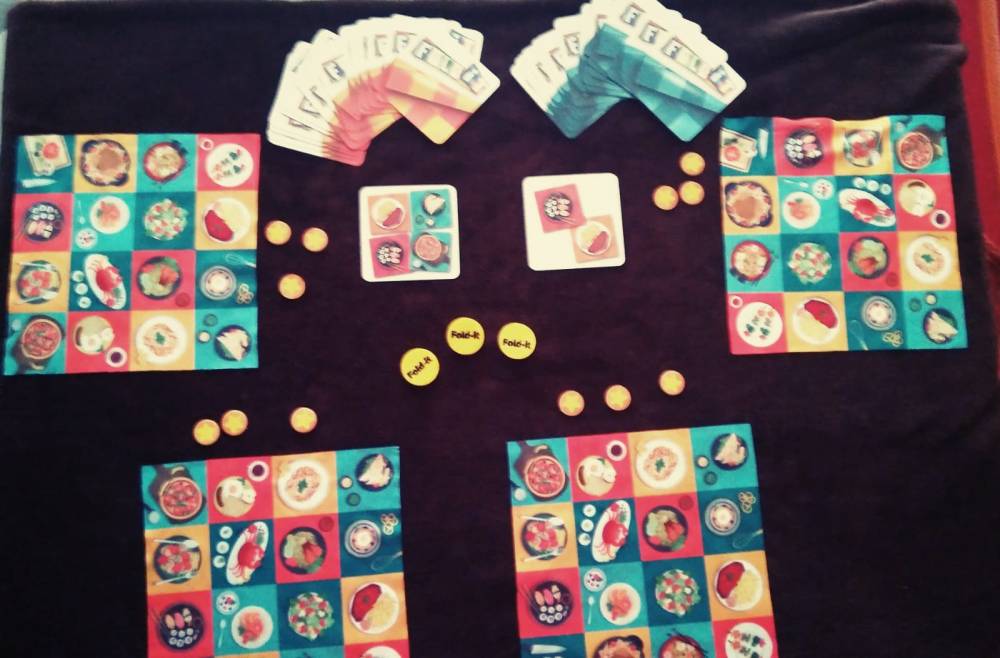 Por orden de finalización, cada jugador tomará una ficha de Fold-it y la colocará sobre su mantel. El último jugador en completar su receta, no logrará la ficha, y por tanto pierde una estrella. El resto de jugadores comprueban que sus recetas son correctas (deben aparecer solo los platos de la tarjeta, independientemente de su orden), y si alguno no es correcto, pierde también una estrella.